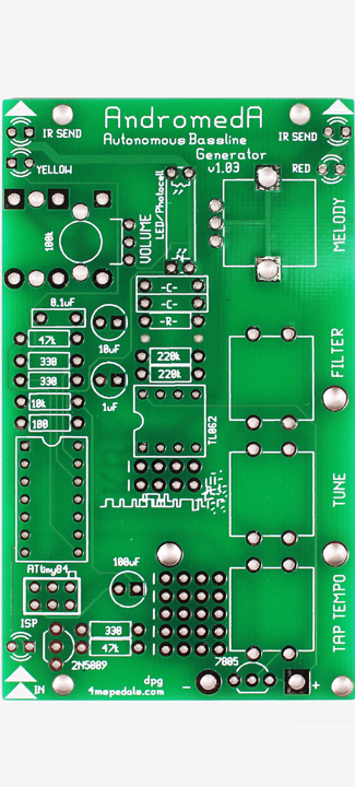 The Autonomous Bassline Generator is a mini synthesizer that generates ever-evolving melodies. Three buttons and two knobs allow for control of pitch, filter, PWM, LFO speed, tap tempo, and melody seed. An analog light-controlled filter gives even more control of sound in this all-in-one performance toy.