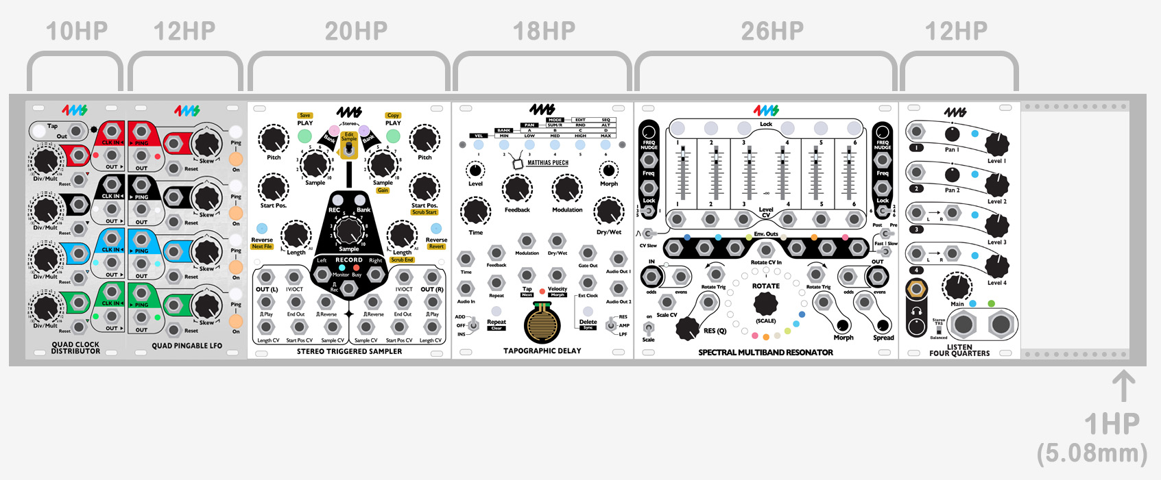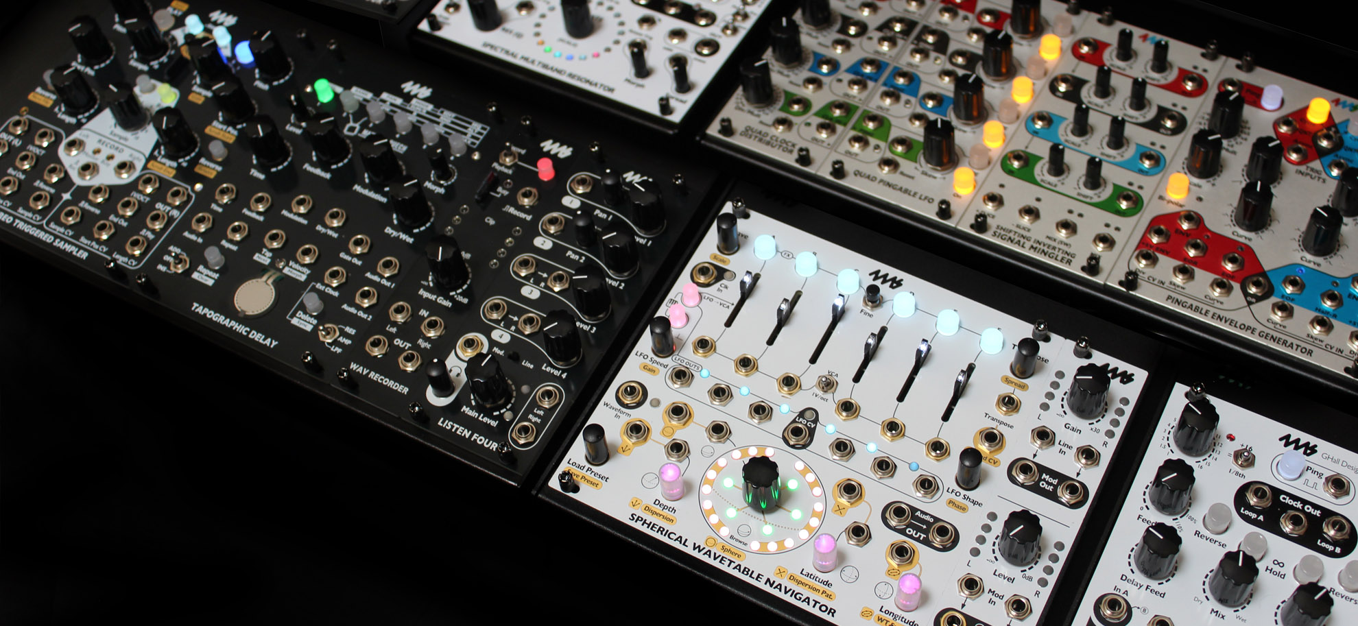 There are many types of modules available for Eurorack, and you can mix-and-match modules from different manufacturers. We make a complete line of Eurorack modules from sound sources, timing and modulation sources, to balanced line and headphone output mixers.