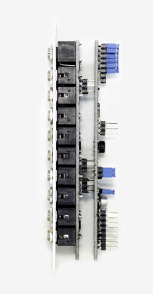 The Rotating Clock Divider (RCD) produces eight divided clock tempos from a single input clock. The divisions range from /1 to /64, including all odd and non-standard divisions such as /3 and /17 and /62. A Rotate CV input re-assigns the division number of each jack, allowing for creative mix-ups and experimentation. A Reset input jack helps to sync/start with an external clock.