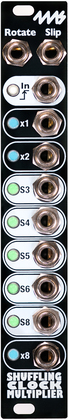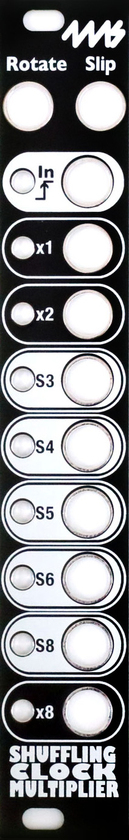 DIY replacement faceplate for the Shuffling Clock Multiplier. Black background with white artwork.