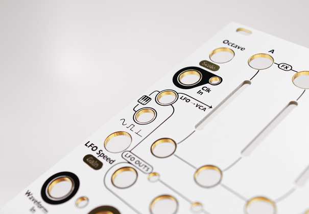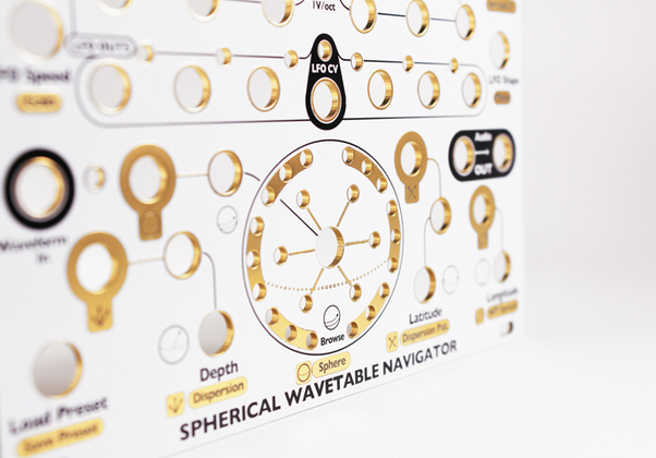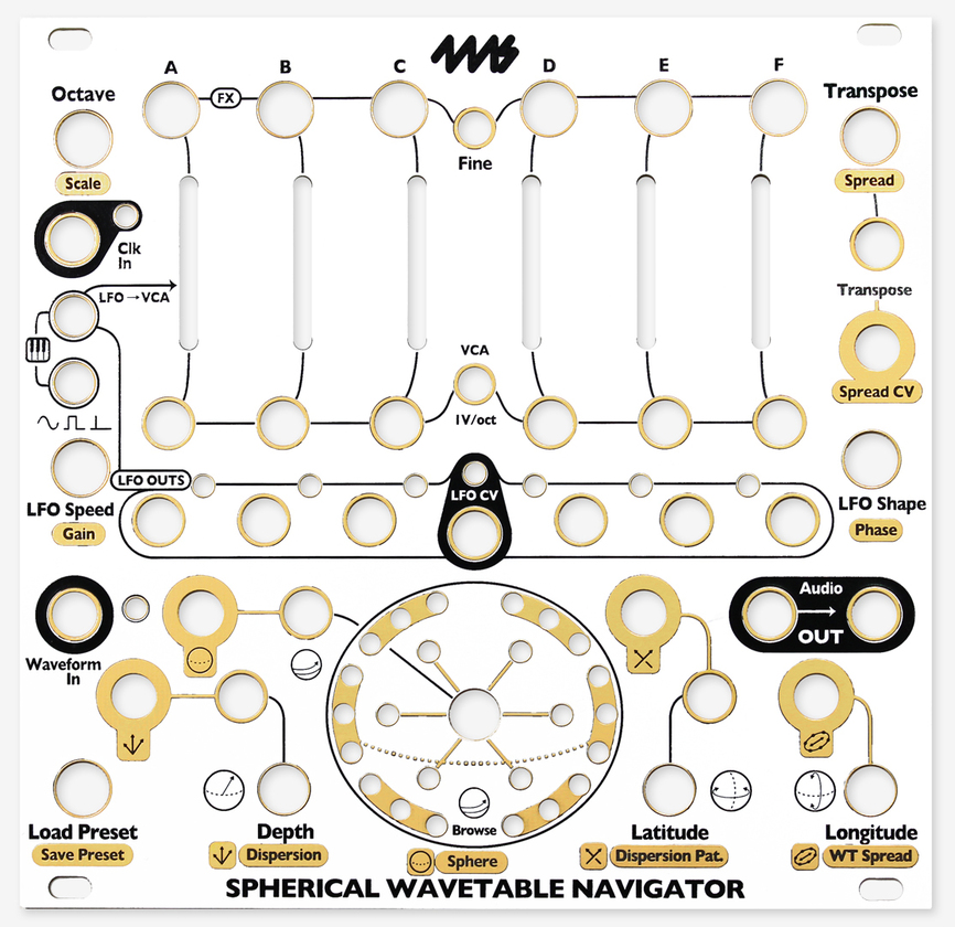 DIY replacement faceplate for the Spherical Wavetable Navigator. White background with black and gold artwork.