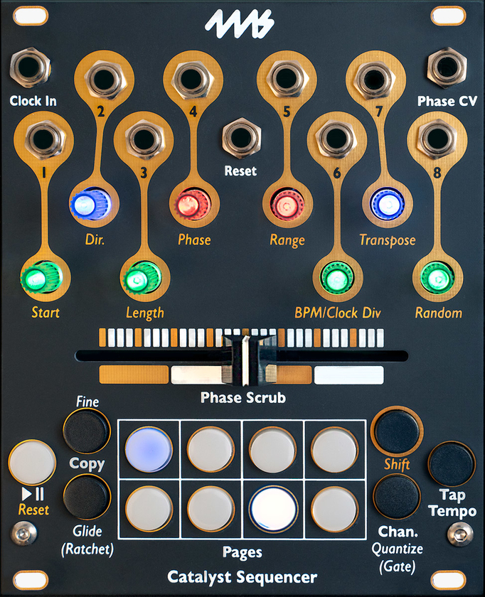 Phase-based sequencing is an advanced form of sequencing where each step is selected by CV. The Catalyst Sequencer has a smooth, responsive crossfader that scrubs the sequence, playing it forward or backwards to track your motions. Patching in a CV signal will do the same: a ramp-up CV plays the sequence forwards, a ramp-down plays it backwards, a triangle plays it ping-pong, and complex waveforms generate new interesting rhythmic and melodic patterns.