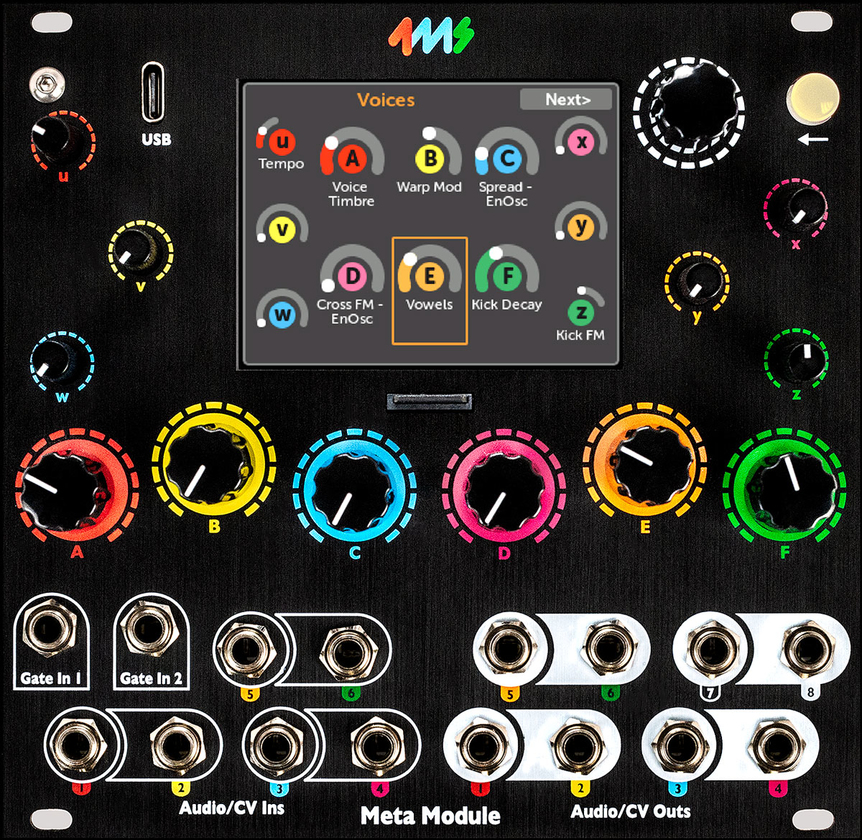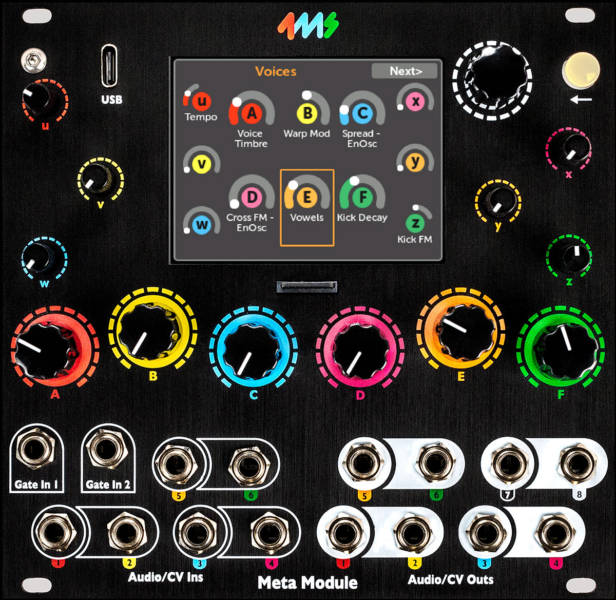 The MetaModule has 12 knobs that can be mapped to virtual knobs. Each knob can be mapped to up eight virtual knobs, and each mapping can have a different range and offset. You also can save a group of mappings as a Knob Set and switch between Knob Sets with the encoder. You also can map the 8 inputs and 8 outputs to virtual module jacks. Also, the MetaModule is a USB MIDI host, so you also can map MIDI CC, note, gate, and other parameters to knobs and jacks.