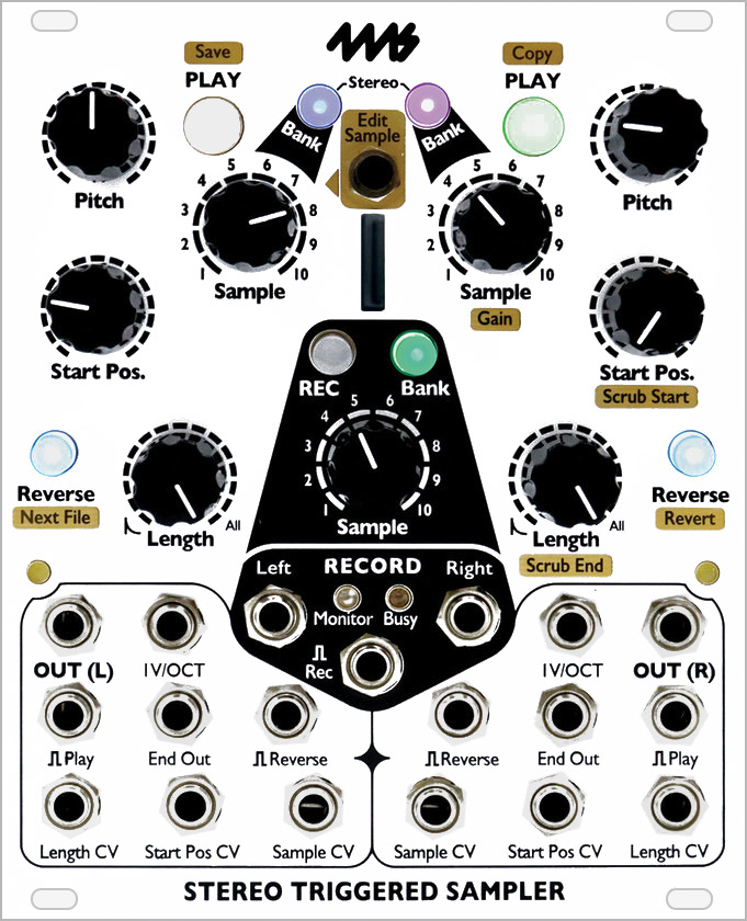 Each playback channel has a knob and CV jack for Sample File selection, as well as a Start Position knob and CV jack for controlling where in the sample playback will begin. The Length knob and CV jack determine how much of the sample is played back: from tiny grains, to percussive hits, to longer loops... or just the entire file. These are powerful tools for re-arranging a sample, joining multiple samples, and creating dynamically re-sized loops within a larger sample. Combined with the Play Trigger jack and the 1V/oct jack, the STS can be two complete multi-timbral pitch-tracked stereo voices!